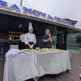 Oben auf dem Sonnendeckt beginnt jetzt die Happy Hour und der Kochkurs für vietnamesische Frühlingsrollen.
