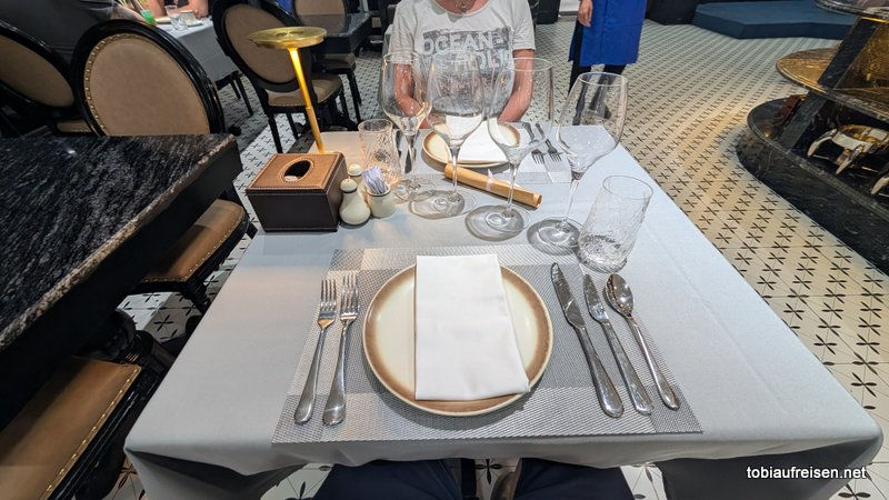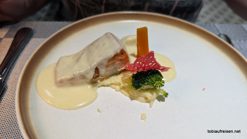 Hier erwartet uns ein fünf Gänge Menü. Die Karte zeigt zwar nur Fischgerichte an, aber auf dem Beiboot wurde man fünf Mal gefragt, was man haben möchte. Ich meinte immer nur, Hauptsache nicht scharf und ohne Fisch. Den Rest esse ich.