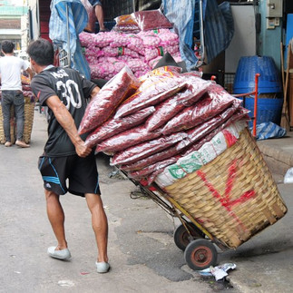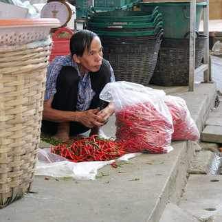 LKW Ladungen kommen immer wieder an und es wird alles ohne technische Hilfe ausgeladen. Die Chilischoten werden per Hand auseinander gezupft und die Blumenkränze werden mit einer detaillierten Ruhe vorbereitet.