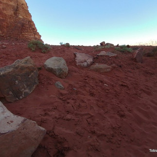 Gesärkt wandern wir nach oben und unsere Mundwinkel hängen wieder nach unten. Die Felsen haben überall geniale Riffel drin und sind so rot. Kleine Steinhaufen sind gebaut worden und man kann sich in den Felsen alles Mögliche zurecht spinnen, was es nun sein könnten.
