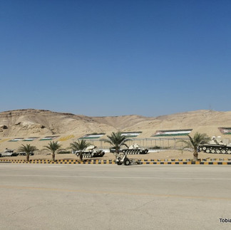 Nach einem Checkpoint, wo wir wieder durchgewinkt werden, ist ein riesen Platz mit mehreren Panzern. Dahinter ist ein Berg wo viele Jordanische Flaggen und ihrer berühmten Krone mit Steinen gelegt worden sind. Es sieht super aus.